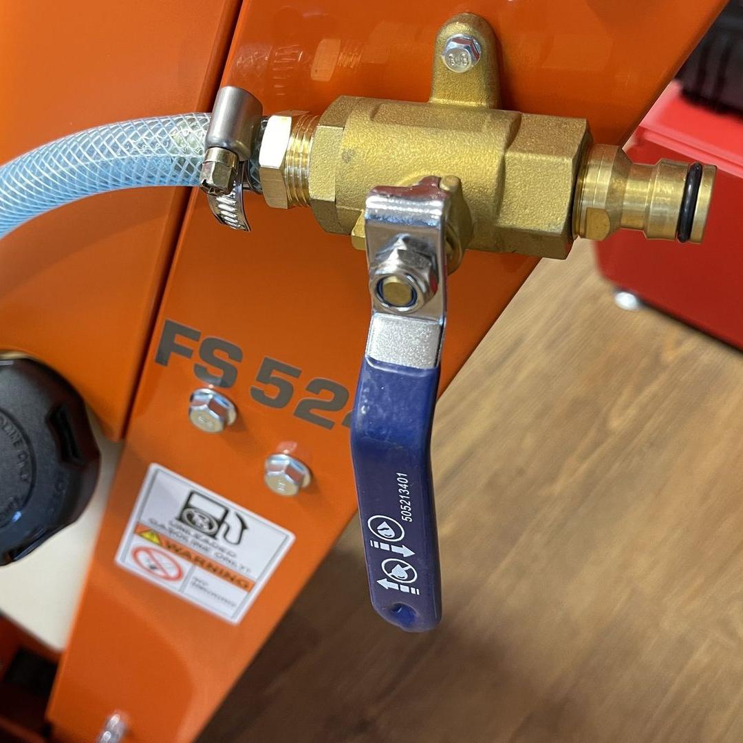 Zawór z przyłączem zewnętrznym wody w Husqvarna FS 524 umożliwia łatwe podłączenie dodatkowego źródła wody, zapewniając ciągłe chłodzenie tarczy podczas długotrwałych prac cięcia.
