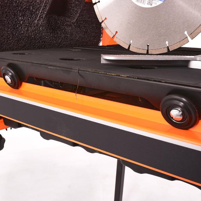 Piła stołowa do kostki Norton Clipper CM 351 UNO wyposażona jest w stół roboczy na rolkach, co ułatwia manipulację i transport materiału ciętego.