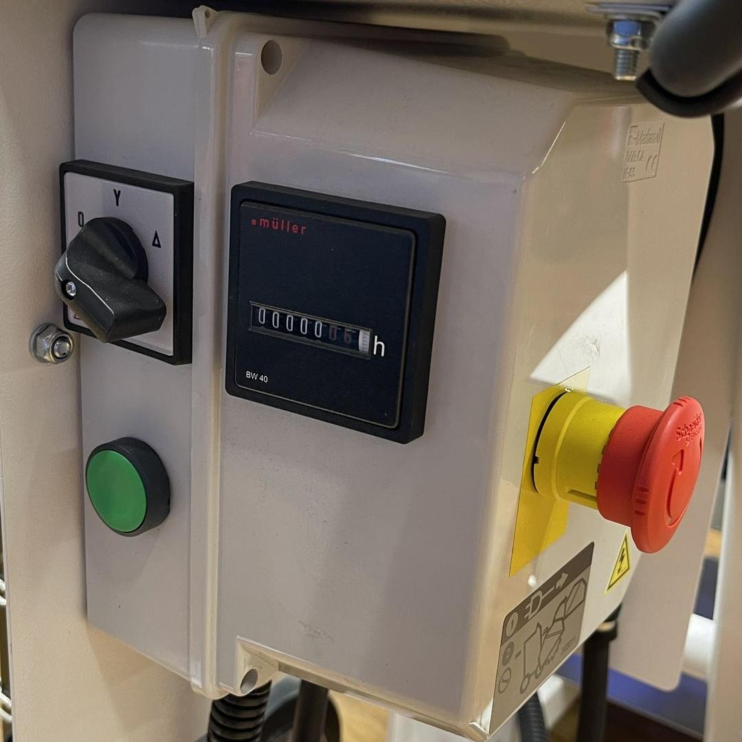 Elektryczna skrzynka sterowania zawiera przełącznik trójkąt-gwiazda, wyłącznik awaryjny oraz licznik motogodzin, co ułatwia zarządzanie pracą maszyny i zwiększa bezpieczeństwo użytkowania.