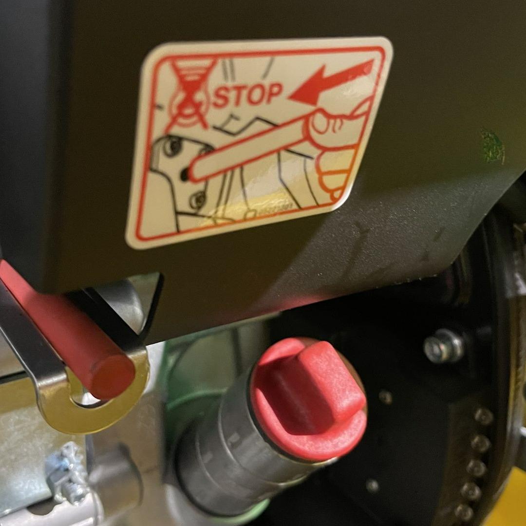 Po prawej stronie znajdują się wyłącznik silnika oraz wlew oleju z miarką, co ułatwia bieżące serwisowanie i zapewnia łatwy dostęp do kluczowych funkcji utrzymania maszyny.